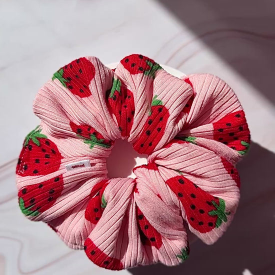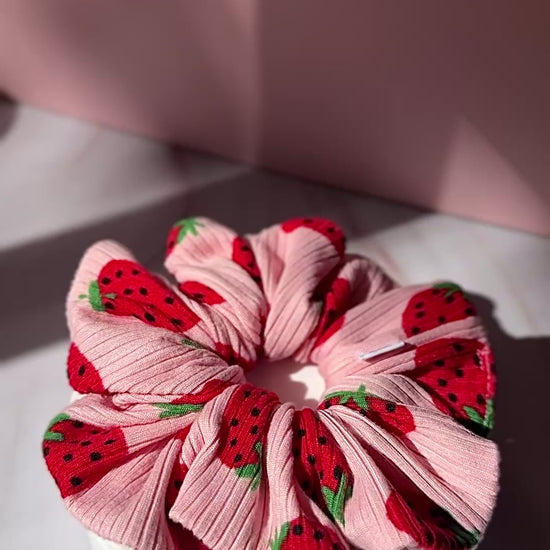 Playful and cute β€” the Berry Sweet Scrunchie is handmade with soft pink ribbed fabric covered in juicy strawberry prints. Sweet, stretchy, and gentle on hair, this scrunchie brings a pop of fun to your everyday look.
