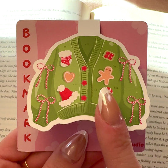 The Cozy Christmas Sweater magnetic bookmark features a festive green sweater with adorable Christmas details — candy canes, mittens, and more!