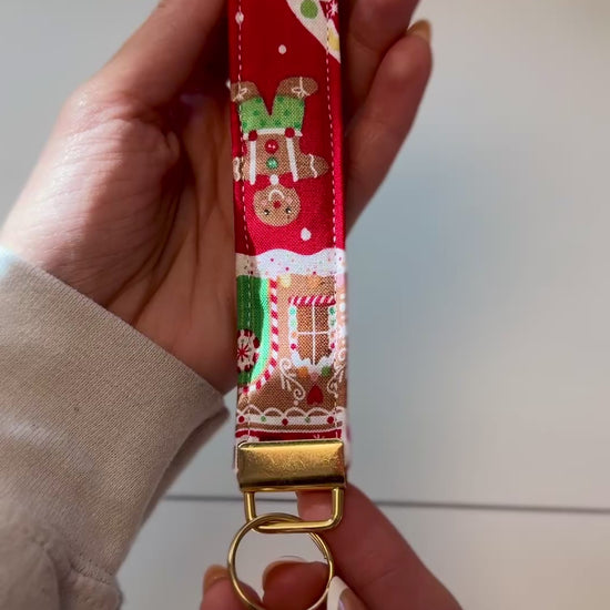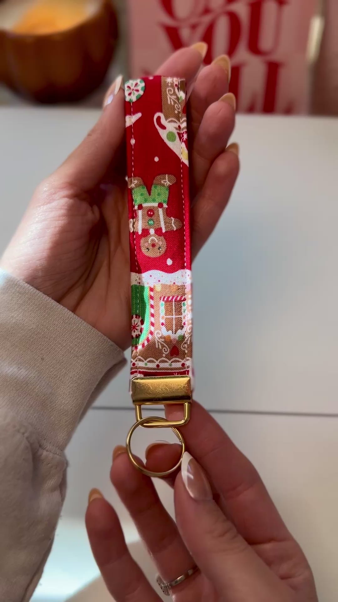 The Cozy Cottage Reads Wristlet Keychain is handmade from soft quilted cotton with a festive red background and gingerbread house details. Paired with gold hardware, itβs the perfect blend of cozy and Christmas.