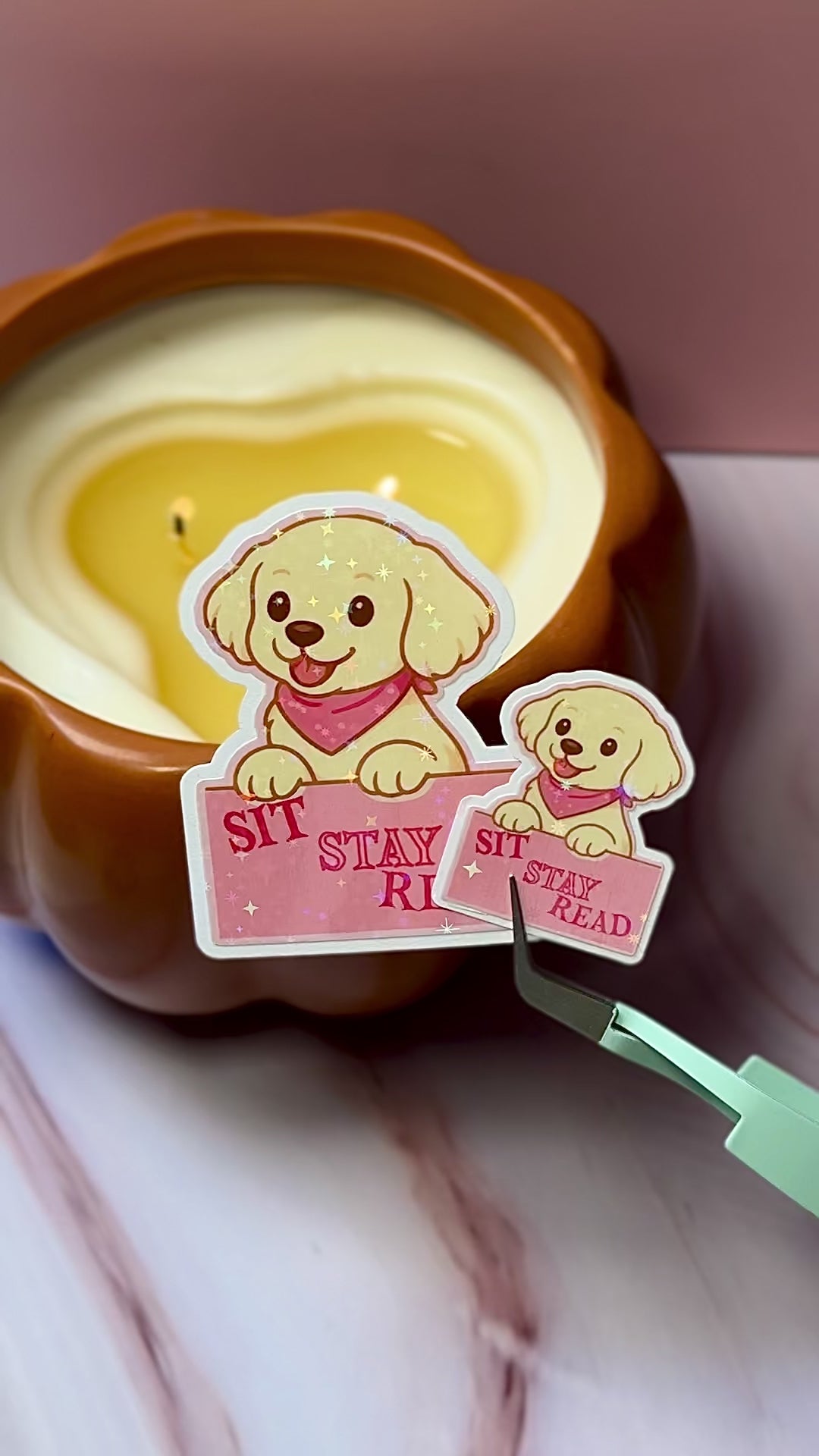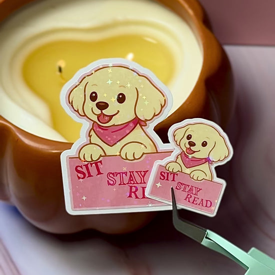 Bring cozy energy to your collection with our Puppy Pages Sticker. This holographic design features a golden puppy in a pink bandana, reminding you to stay cozy and read more books. A sweet collectible for dog lovers, readers, and anyone who loves kawaii stickers.