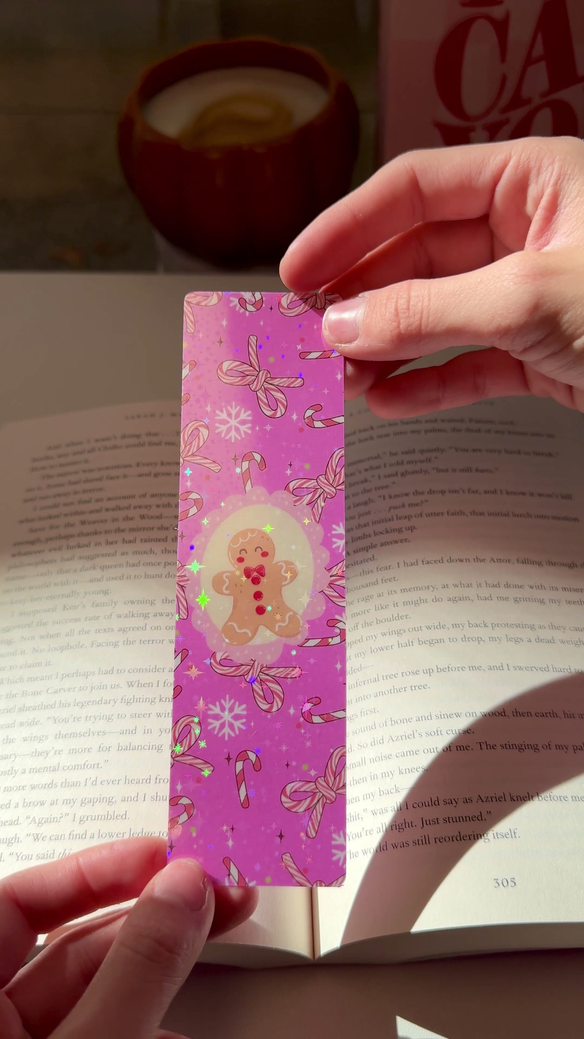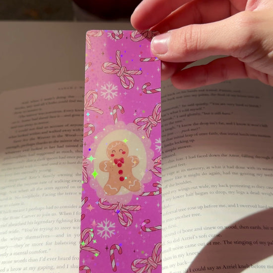 For those who can’t resist candy canes and cookies! This pink holiday bookmark features a smiling gingerbread cookie surrounded by candy canes and pink bows — perfect for your holiday reading season.