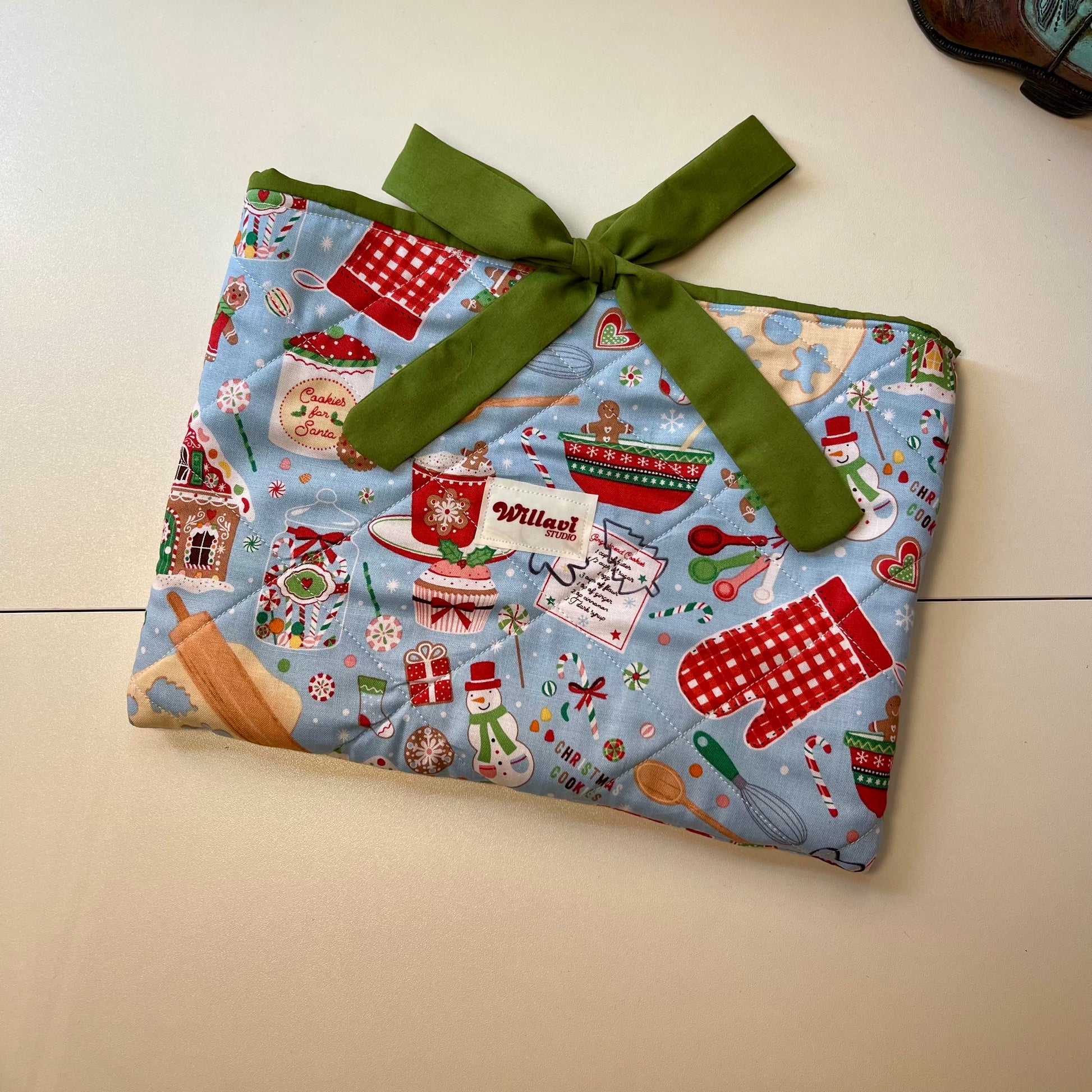 The Holly Jolly Reads book sleeve is a joyful blend of cozy fabrics and playful design. With a light blue background covered in gingerbread, rolling pins, and festive treats, itβs handmade to protect your books while spreading holiday happiness.