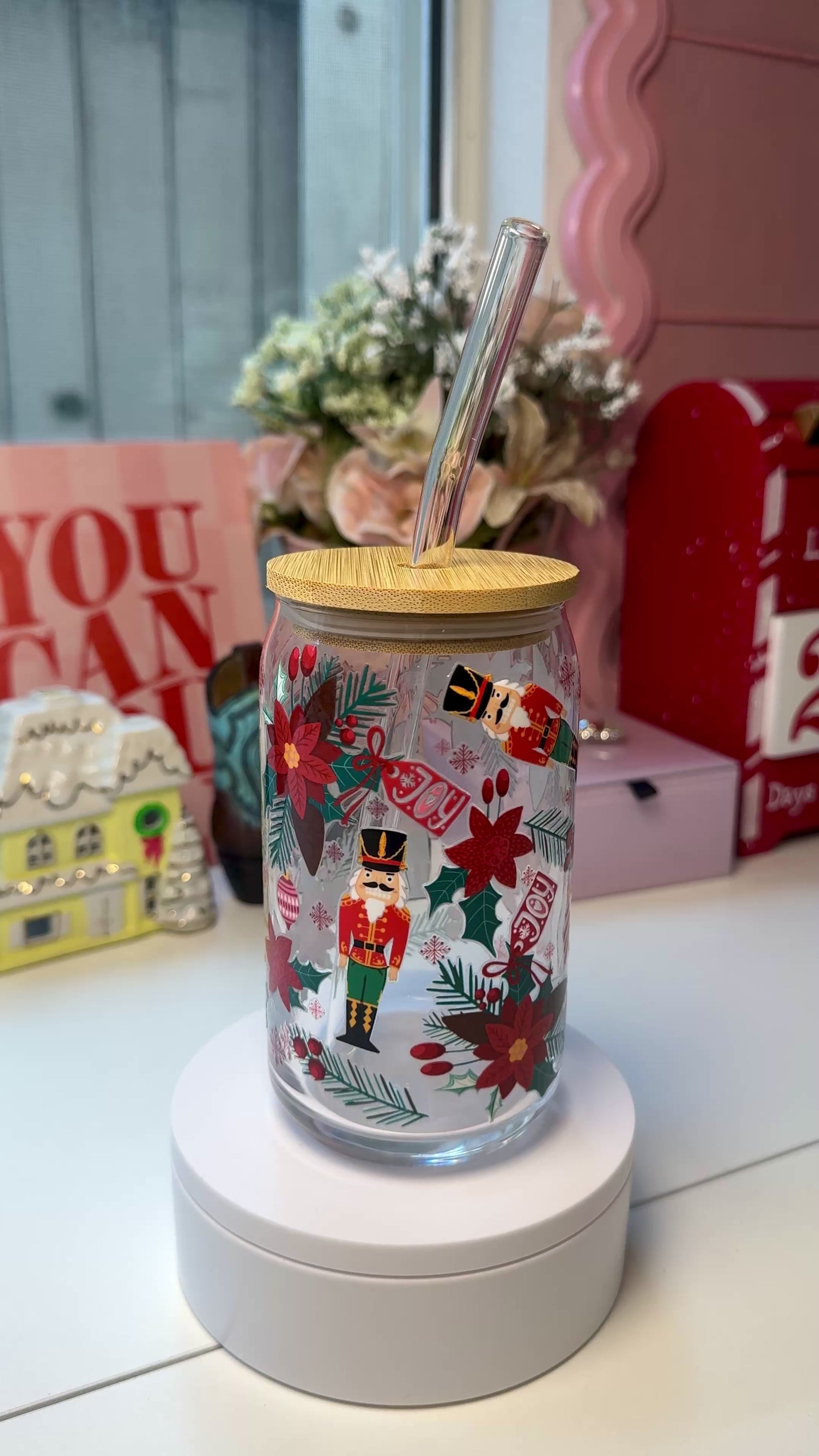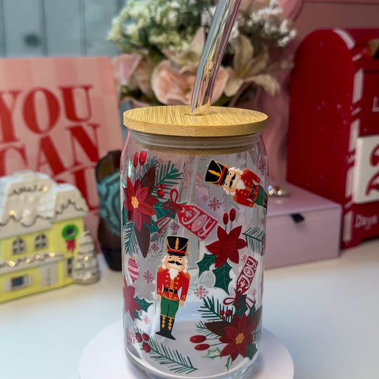 A festive sip of holiday cheer — a cozy 16 oz glass cup wrapped in bright poinsettias, nutcrackers, candy canes, winter florals, and soft red details. Comes with a smooth bamboo lid and a clear glass straw for the cutest seasonal drink moment.