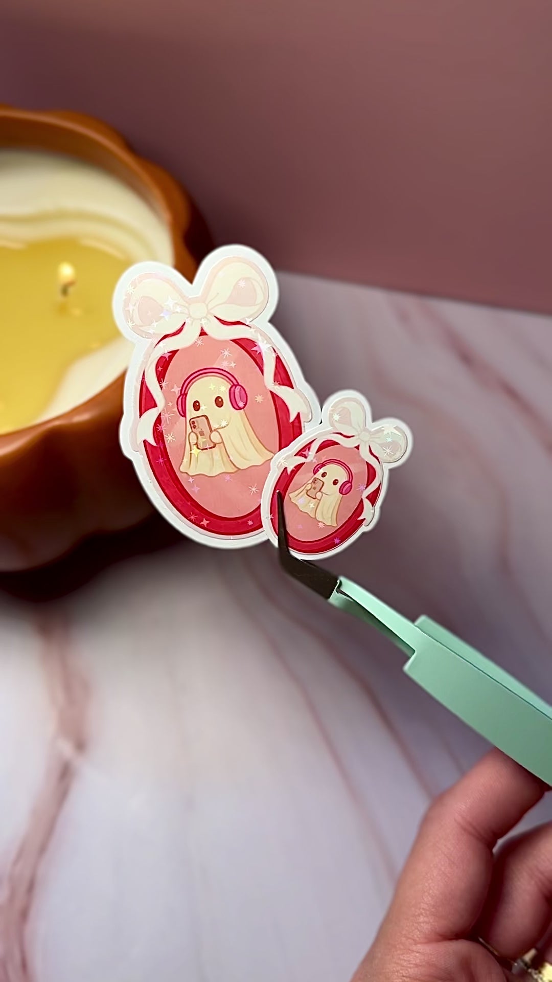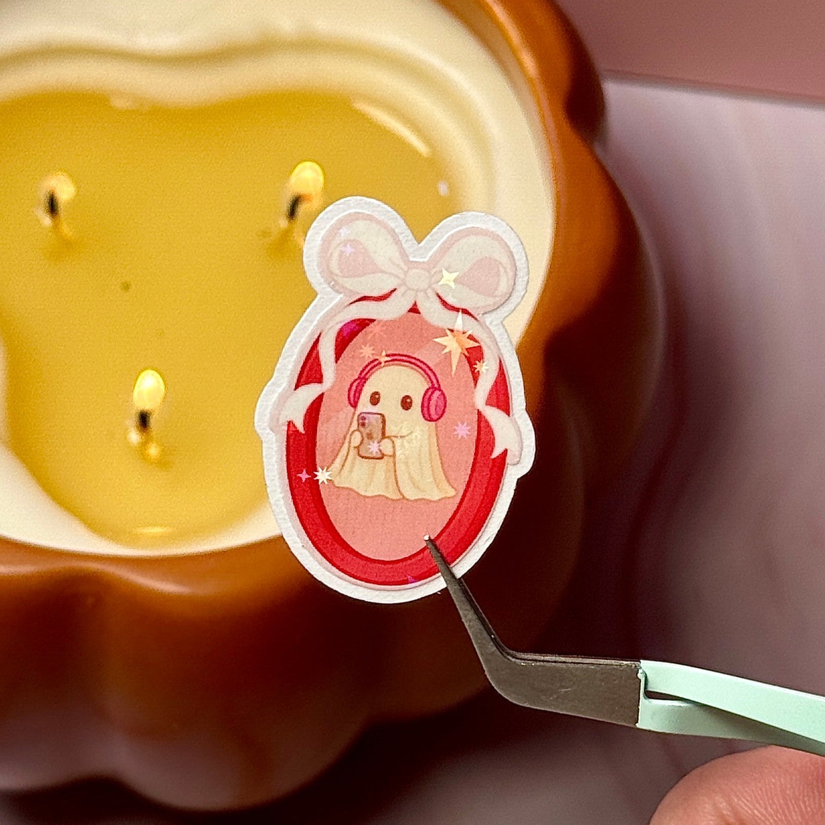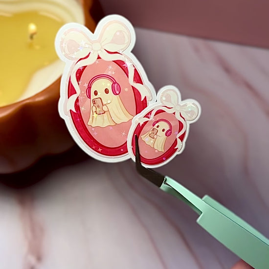 Add a little spooky sweetness to your collection with our Ghost with Headphones Sticker. Featuring a pastel ghost framed in a bow, listening to music and scrolling her phone, this holographic design brings cozy + cute vibes wherever you stick it. Perfect for journals, Kindles, and seasonal swaps!