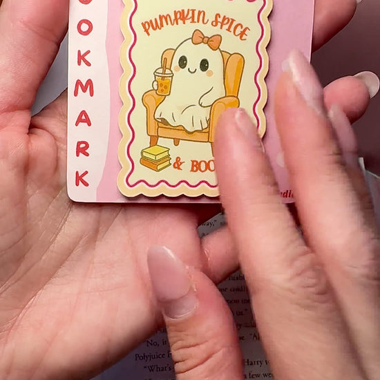 Celebrate autumn with the Pumpkin Spice Ghostie Magnetic Bookmark. Handmade with a pastel pink background and a cozy ghost sipping coffee, this bookmark adds a sweet seasonal touch to your reading routine.