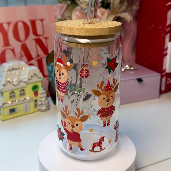 A little touch of holiday warmth for your everyday drinks — a cozy 16 oz glass cup wrapped in playful Christmas reindeer, complete with a smooth bamboo lid and clear glass straw.