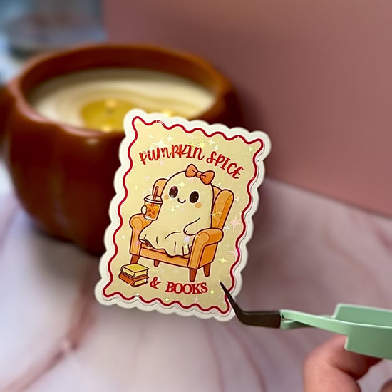 Curl up with a PSL and your favorite book — this sticker is here for the cozy vibes! Our Pumpkin Spice Ghostie holographic sticker is perfect for journals, planners, and Kindles. Featuring a sweet ghost sipping pumpkin spice in a cozy chair surrounded by books, it’s the ultimate autumn accessory.