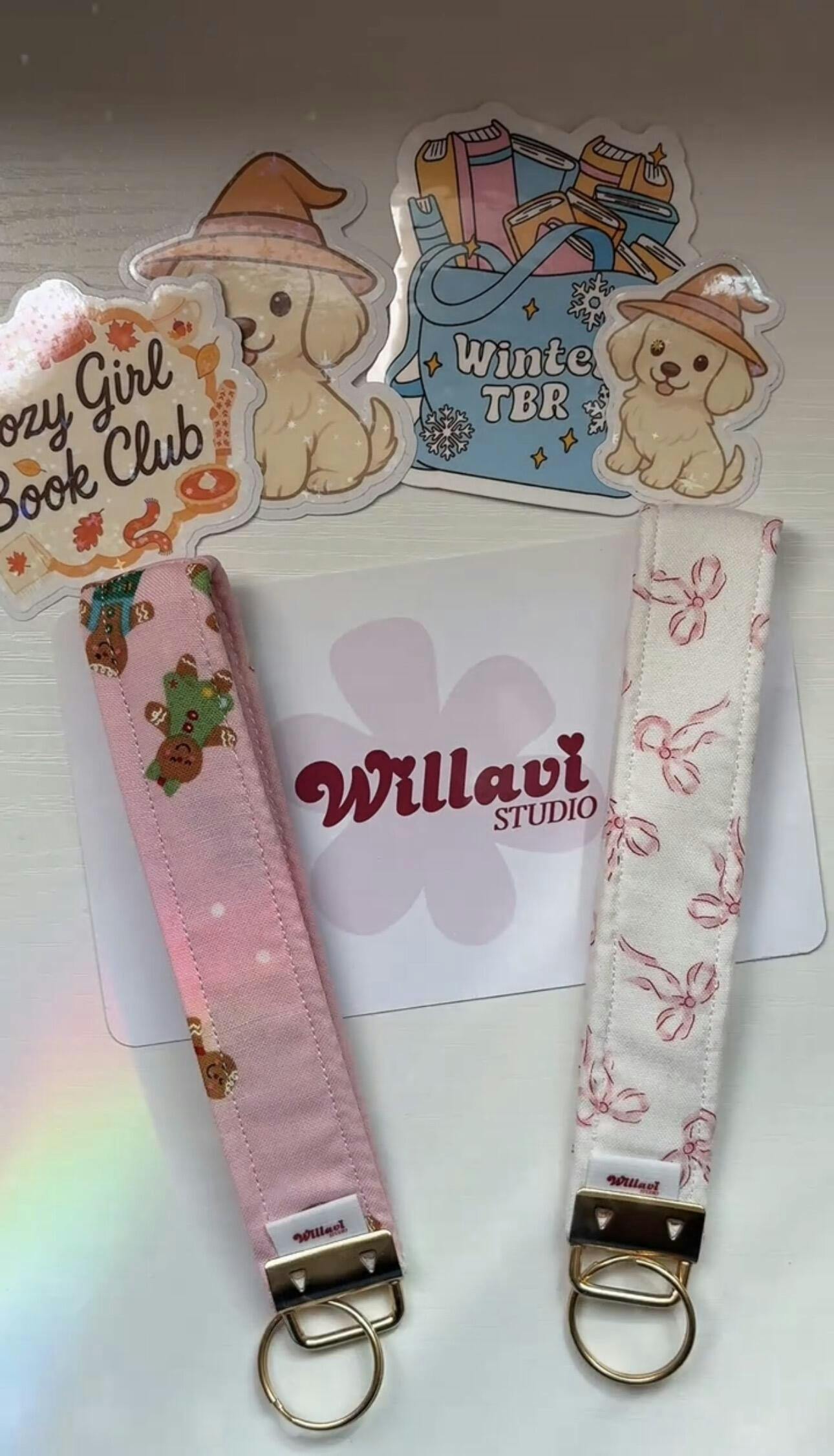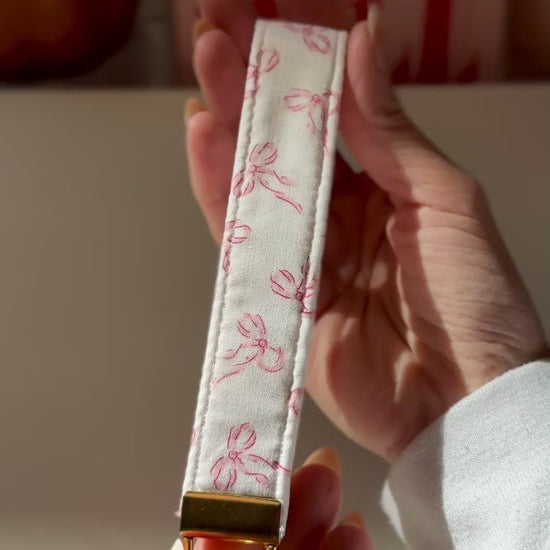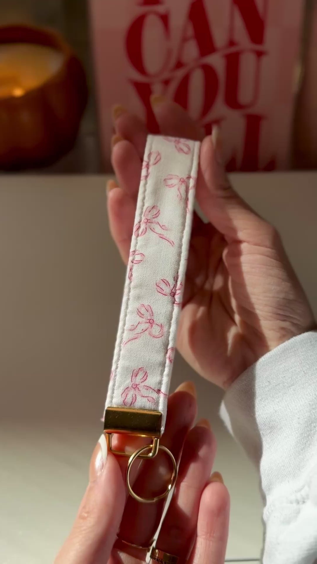 The Winter Bow Wristlet Keychain is handmade with 100% cotton fabric and finished with gold hardware. Its soft white background and delicate pink bows bring a cozy, feminine touch to your keys or bag β perfect for everyday use or gifting.